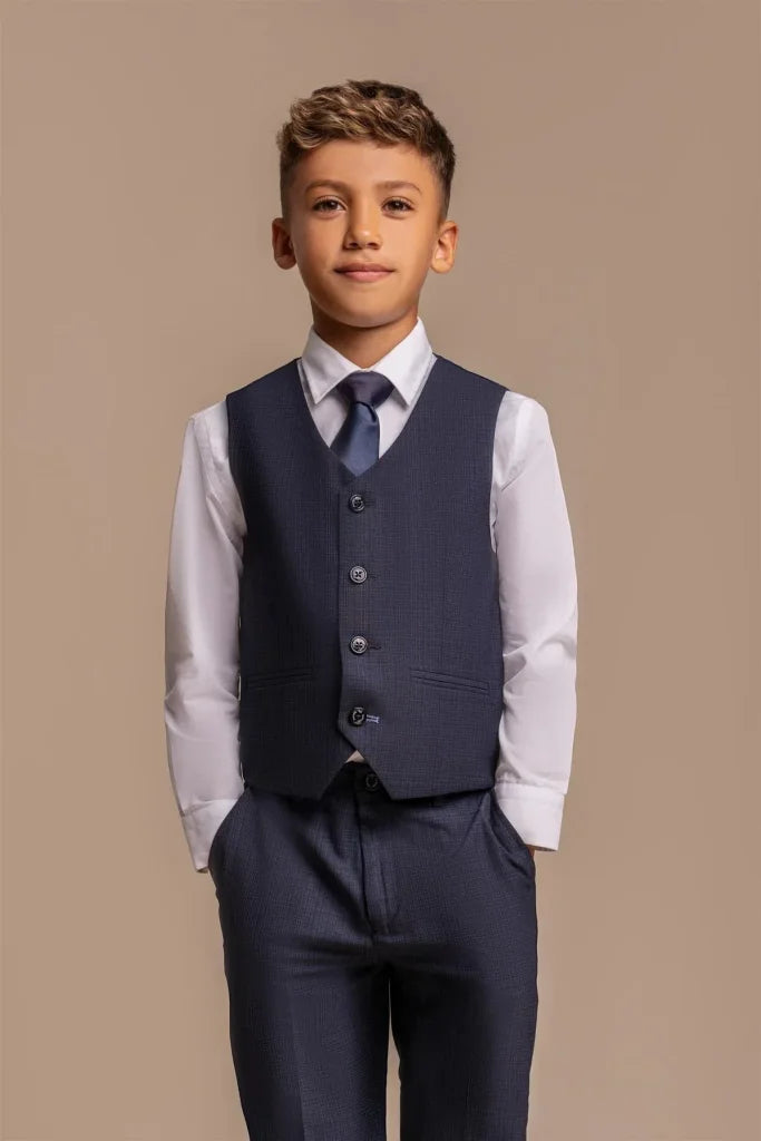 Der Kinderanzug Seeba von Cavani ist ein echter Allrounder für jede Jahreszeit. Er eignet sich ideal für Sommer und Winter, da er vielseitig kombinierbar ist. Sakko, Weste und Hose lassen sich auch locker mit einem Casual-Outfit kombinieren – egal ob warm oder kühl. Die Ein-Knopf-Details an der Weste machen es ideal, das Sakko an warmen Tagen einfach auszuziehen, sodass die schönen Weste-Details besonders zur Geltung kommen.