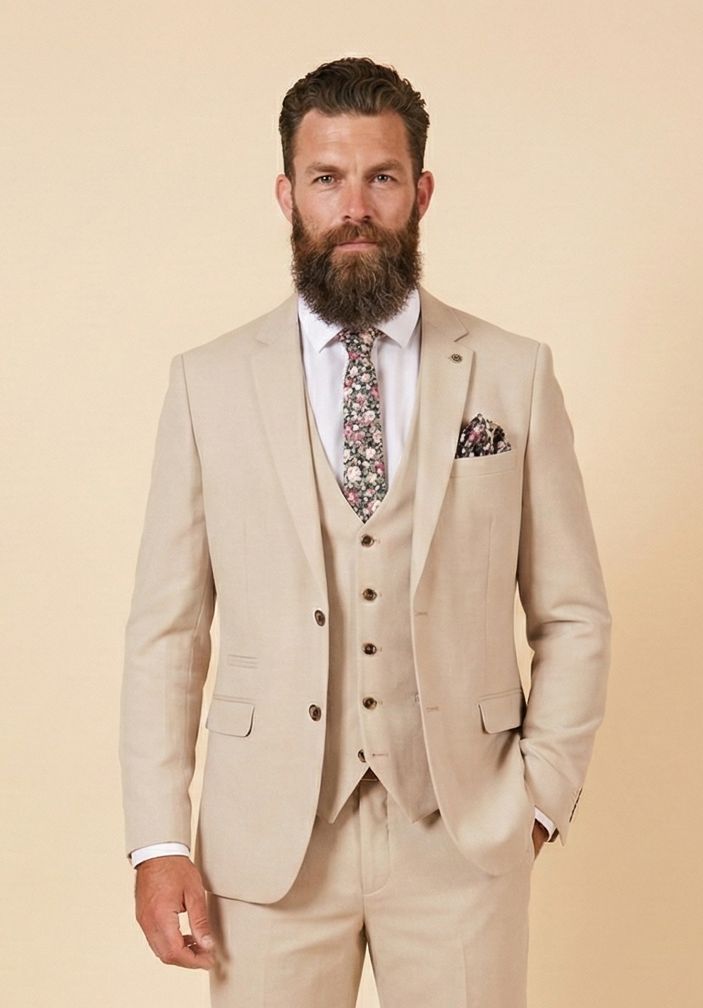 Wszystko zaczyna się od wrażeń. Garnitur HM5 Stone to nie tylko lekkość; łapie letnie światło i oddaje je jako pewność siebie. Wychodzisz na taras lub wchodzisz do wiekowego kościoła, gdzie powietrze pachnie różami i szampanem. Tkanina w kolorze kamienia – czysta, miękka, wyrazista bez krzyku. Marynarka delikatnie opada na ramiona, kamizelka podkreśla sylwetkę, a spodnie idą za Tobą jakby same.