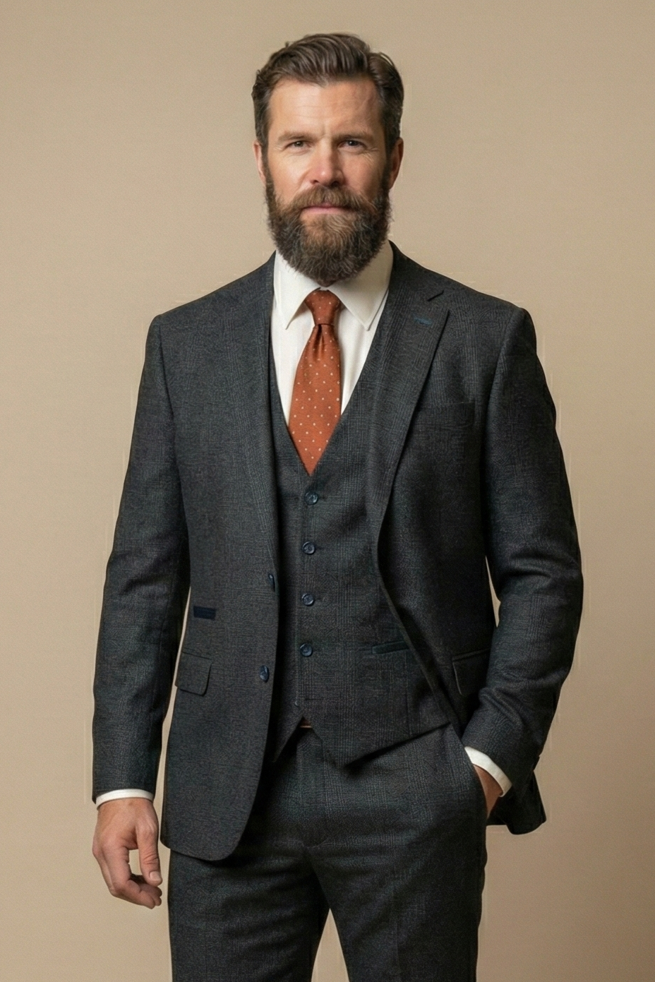 Einzigartige Farbe und Textur Der Stoff hat einen wunderschönen, tiefen olivgrünen Farbton mit einem dezenten eingewebten Muster. Das verleiht dem Anzug den begehrten, authentischen englischen Tweed-Look, jedoch mit dem Tragekomfort von heute. Die Farbe ist vielseitig: dunkel genug für formelle Anlässe, aber ausdrucksstark genug, um auf einer Hochzeit oder einem besonderen Dinner herauszustechen.