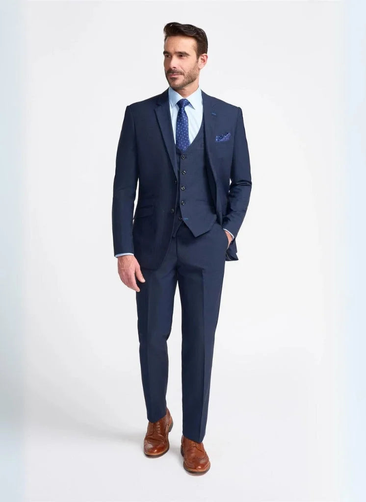 Granatowy kolor marynarki emanuje elegancją i wszechstronnością. Pasuje niemal do każdego stroju i okazji – od spotkań biznesowych po uroczystości. Marynarka posiada kołnierz z klapami, który nadaje jej klasycznego i wyrafinowanego charakteru. Podwójne rozcięcie z tyłu zapewnia większą swobodę ruchów i komfort, zwłaszcza gdy dużo siedzisz lub się poruszasz. Czarne guziki stanowią stylowy kontrast i dopełniają całość.