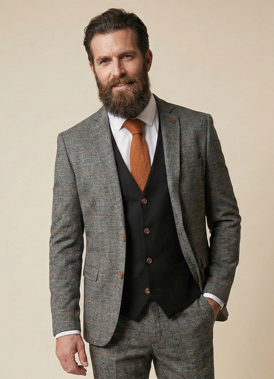 Zwróć uwagę na wykończenie. Brązowe guziki dodają całości wyrazistego charakteru, subtelna krata pięknie odbija światło. Stylowa poszetka, przypinka do klapy – każdy detal jest dopracowany. Wszystko idealnie do siebie pasuje, dzięki czemu wyglądasz nie tylko elegancko, ale też pokazujesz wyczucie stylu.