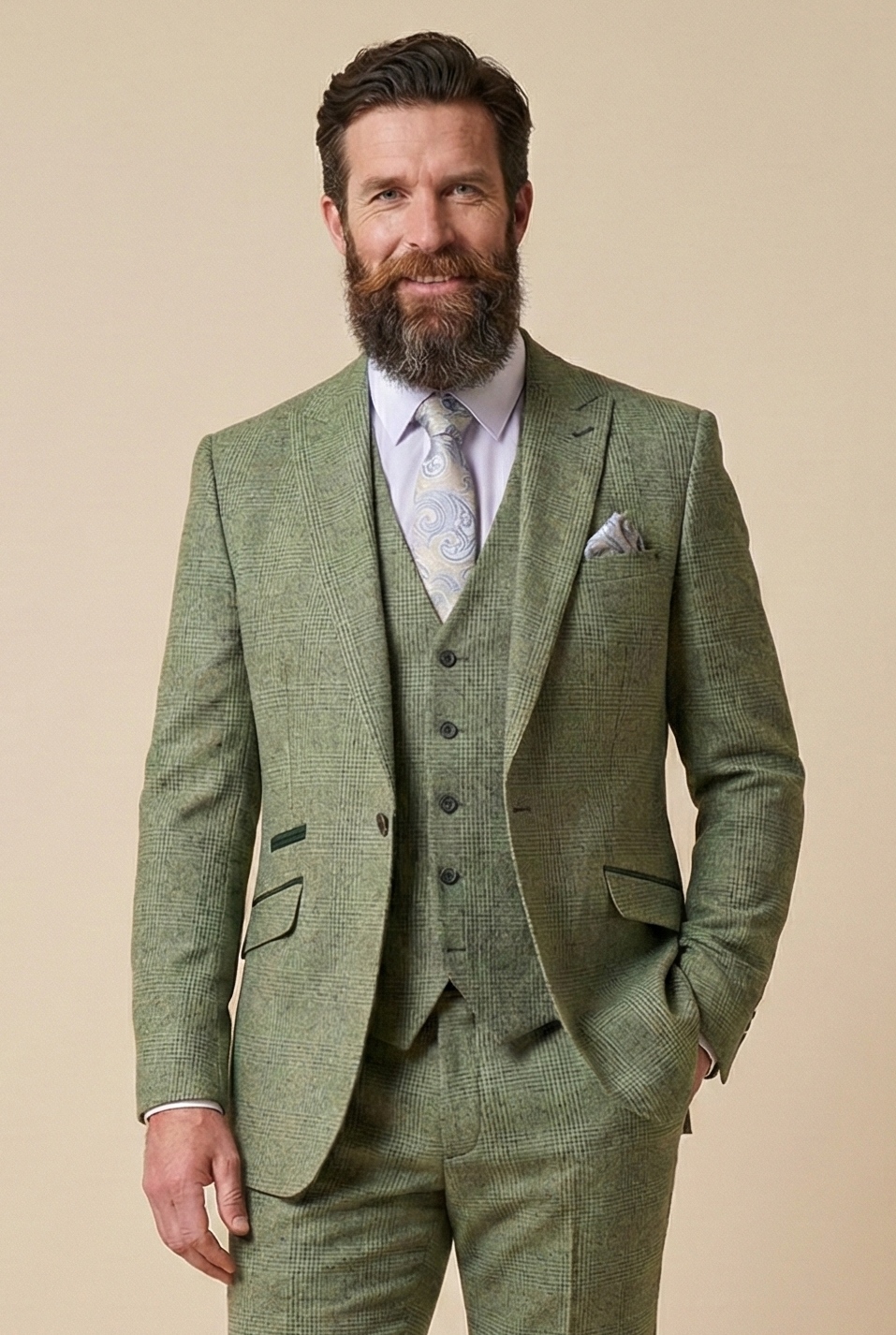 To wybór, na który w tym sezonie decydują się mężczyźni świadomi stylu: trzyczęściowy garnitur w szałwiowej zieleni Cavani Caridi. Nie klasyczny granat ani nudna szarość, ale kolor z charakterem – subtelny, dojrzały, wszechstronny. Sage Green łatwo dopasować do każdej okazji. W ciągu dnia garnitur emanuje świeżością, lekkością i energią, a po zachodzie słońca zieleń nabiera głębi i wyrafinowania. Delikatna kratka dodaje całości życia i rytmu.